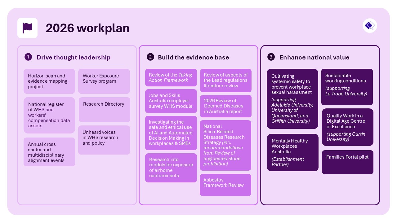 The 2026 research workplan builds on Safe Work Australia’s continuing research activities that support policy development. It also introduces new activities designed to directly advance the Research and Evaluation Strategy’s goals and deliver evidence with national value.